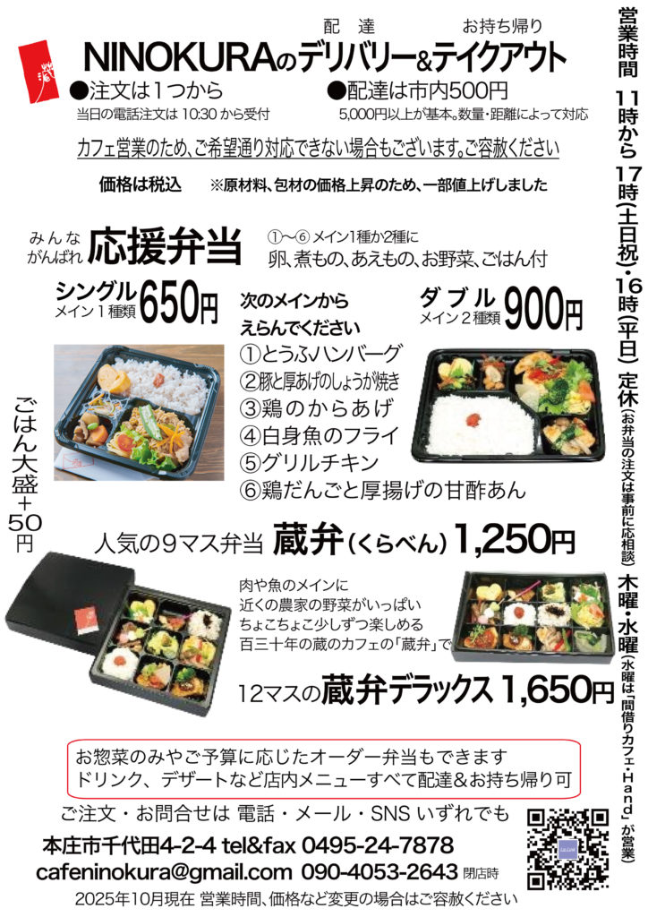食材はおもに近辺の生産者から、コーヒーは本庄銀座の老舗「コスタリカ」焙煎。どの品もテイクアウトできます。お弁当はご注文に合わせてつくります。
